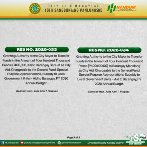 Granting Authority to the City Mayor to Transfer Funds in the Amount of Four Hundred Thousand Pesos (P400,000.00) to Barangay Mahalang as City Aid, Chargeable to the General Fund, Special Purpose Appropriations, Subsidy to Local Government Units – Aid to Barangay, FY 2026 Annual Budget.